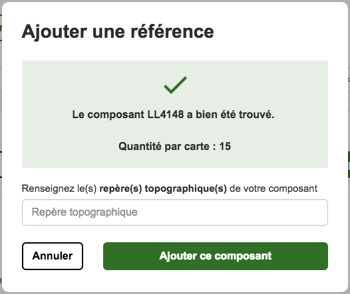 - Si la référence exacte est trouvée, le système le confirme. Indiquez alors le(s) repère(s) topographique(s) et cliquez sur "Ajouter ce composant".